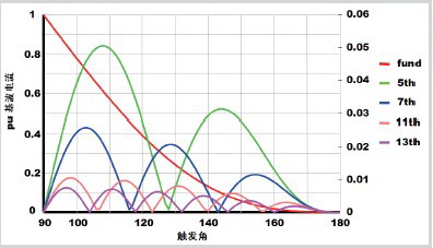 TCR支路往往采用三角形接法,被控的相控電抗器一般分裂為兩個,分別接于晶閘管閥組兩側,以減小流過晶閘管閥組的短路電流。一般用觸發角α (亦稱之為點火角)來表示晶閘管的觸發瞬間,即從電壓過零點到觸發點的電角度。每半周波電抗器導通角用δ表示。導通角δ及電抗器電流取決于觸發角α,當α為180°時,電抗器不投入運行,當α為90°時,電抗器電流達最大值。上圖為TCR單相電路原理和TCR單相電路原理電流電壓波形圖。下圖是TCR不同觸發角時產生的諧波情況,因此TCR必須有5次和7次濾波支路。