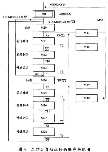 在工作臺自動循環往返過程的開始階段,要求工作臺處于前進減速行程開關X4和后退減速行程開關X5之間,如果工作臺沒有在這個區間,應在步進或步退方式下,按點動按鈕,將工作臺調整到該范圍之內。將油泵轉換開關置于‘接通’位置,若風機和油泵動作,則工作臺自動運行的外部條件符合要求。工作臺自動運行的順序功能圖如圖4所示。