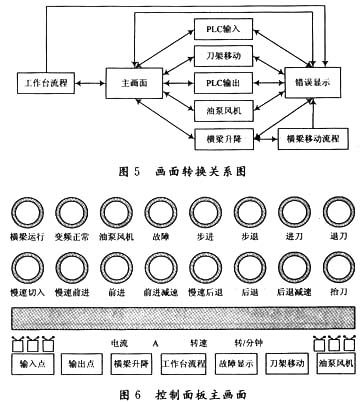 主畫面形象直觀地顯示龍門刨床工作臺的往復運動狀態、抬刀動作和與工作臺有關的限位開關的通斷狀態。用指示燈顯示工作臺的各種狀態,例如前進、后退、慢速切入、前進減速和后退減速,以及工作臺步進和步退.。還用指示燈顯示油泵風機、變頻器的狀態,以及進刀、退刀和故障信號等。畫面轉換關系和主畫面如圖5和圖6所示。