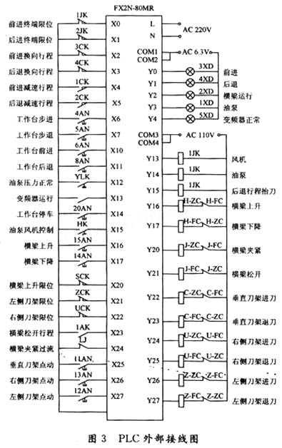 PLC用于實現開關量邏輯控制和控制變頻電機轉速的方向和大小。按鈕站的按鈕、外部行程開關和操作手柄通過PLC,控制油泵、風機、橫梁升降、橫梁夾緊、垂直刀架、右側刀架、左側刀架的電動機,以及后退行程抬刀電磁鐵線圈。
